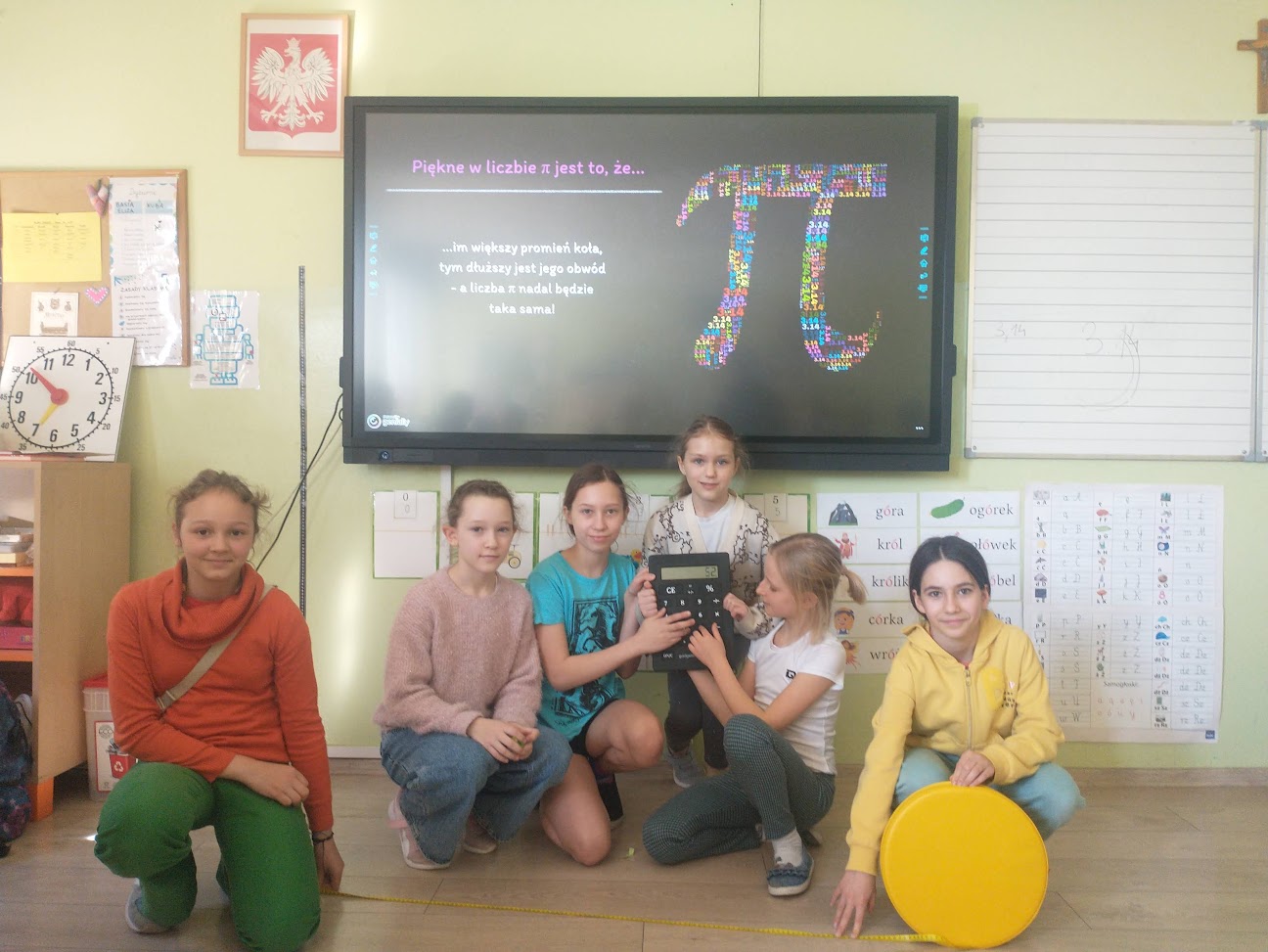 Z okazji Dnia liczby Pi uczennice klasy 4b odwiedziły swoich młodszych kolegów i koleżanki z klasy 1b, aby przybliżyć im istotę tej liczby. Dzieci obejrzały prezentację, wysłuchały wyjaśnień starszych koleżanek i pod ich kierunkiem przeprowadziły odpowiednie pomiary, które pomogły im doświadczalnie zrozumieć, czym jest liczba Pi. Dziękujemy uczennicom klasy 4b za ciekawe zajęcia i inspirację do dalszego poznawania tajników matematyki.