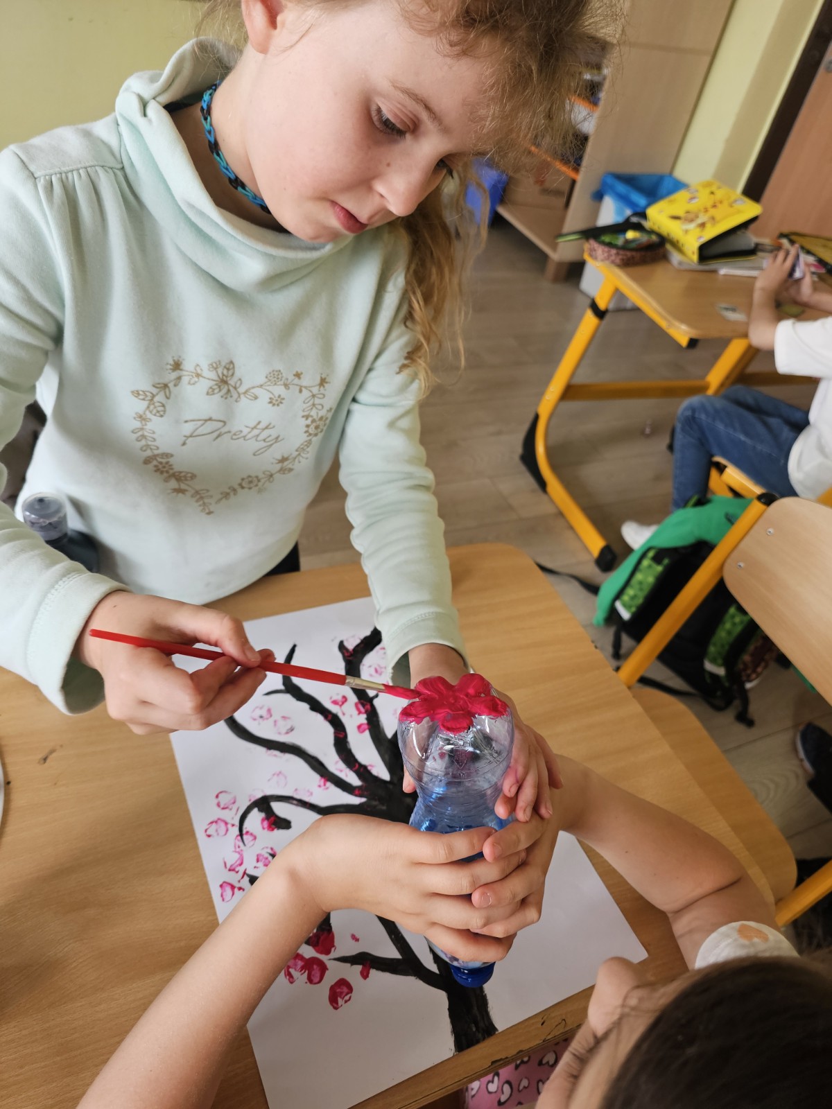 W minionym tygodniu nasza świetlica zamieniła się w kwitnący sad! Rozmawialiśmy o drzewach owocowych, oglądaliśmy zdjęcia sadów i poznawaliśmy, jak powstają nowe drzewka – przez szczepienie i okulizację. Dzieci z ciekawością przyglądały się narzędziom i maszynom używanym w sadownictwie. Dowiedzieliśmy się także, jak ważne są owady w zapylaniu kwiatów i obejrzeliśmy film „Od kwiatu do owocu”. Wysłuchaliśmy wiersza H. Zdzitowieckiej „Biały sad”, który wprowadził nas w prawdziwie wiosenny nastrój. Nie zabrakło ruchu i śpiewu – bawiliśmy się przy piosence „Duszek Babu-Babu idzie do sadu” i śpiewaliśmy „Wiosna już tu jest”. Na zakończenie dzieci stworzyły piękne obrazy kwitnących wiśni, malując farbami i wykorzystując stemple oraz folię bąbelkową. To był tydzień pełen wiedzy, zabawy i wiosennej radości!