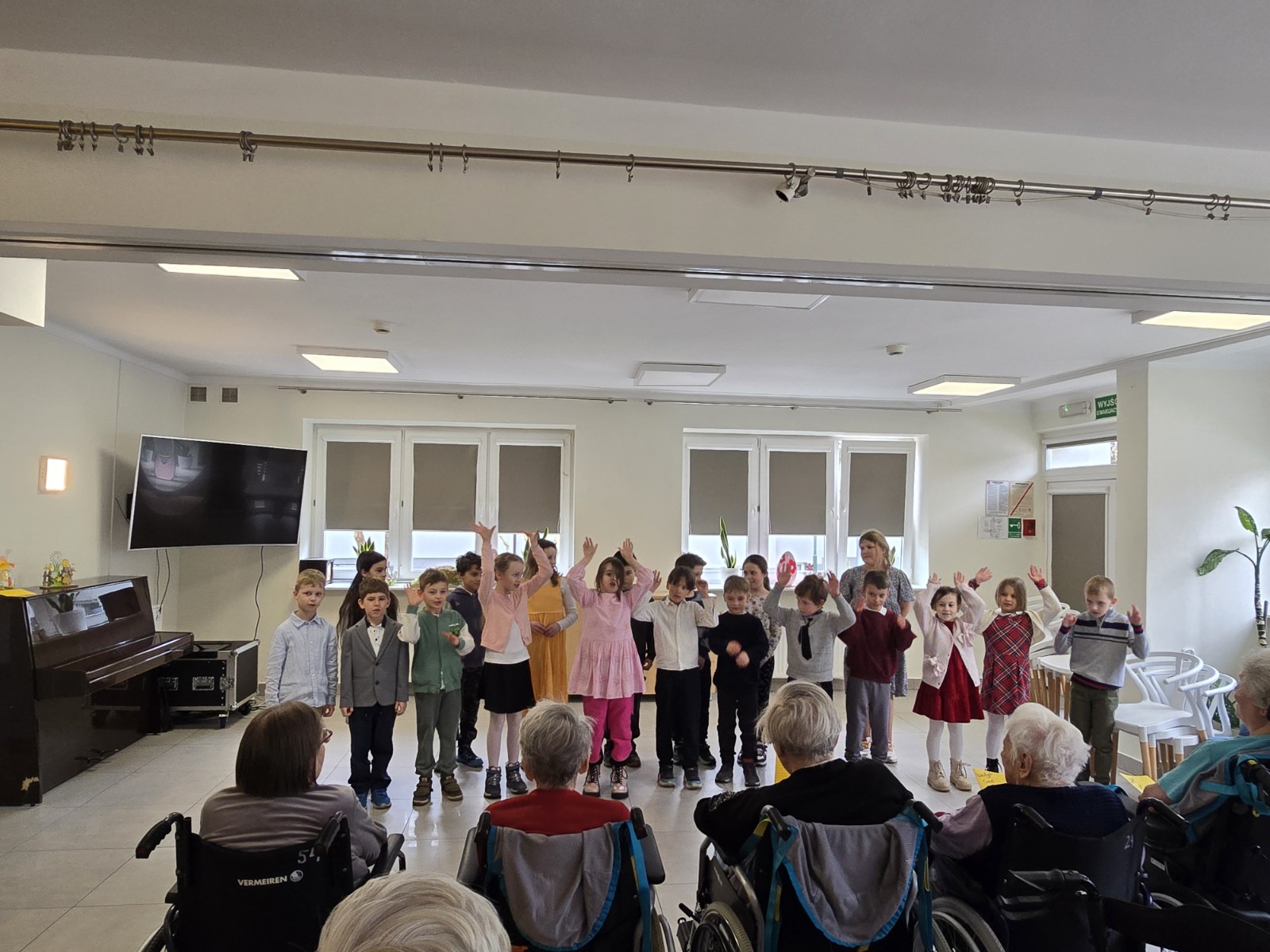 Dzieci zaprezentowały pełen energii i zaangażowania występ wokalny oraz ofiarowały własnoręcznie wykonane wielkanocne kartki.
